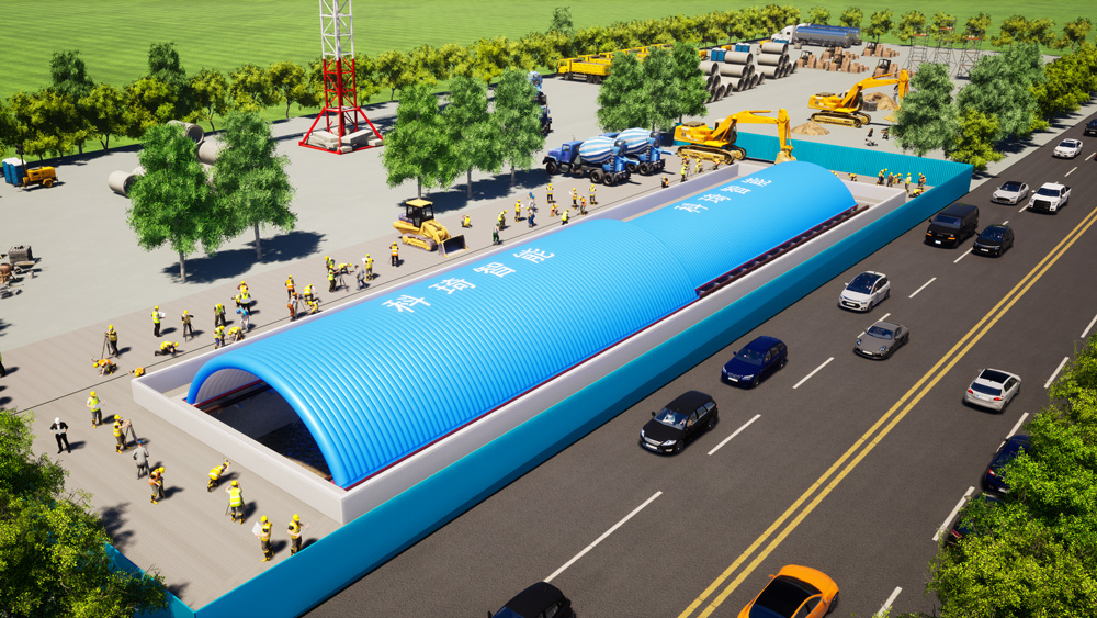 采用 “2+1” 分段式模塊化設(shè)計(jì) —— 中間主段長(zhǎng) 22 米,兩側(cè)拓展段各長(zhǎng) 15米,底部嵌入軌道式移動(dòng)基座,可隨基坑開(kāi)挖進(jìn)度同步平移;氣膜表面配備智能?chē)娏芟到y(tǒng),結(jié)合密閉式通風(fēng)過(guò)濾裝置,實(shí)現(xiàn)環(huán)保目標(biāo)。